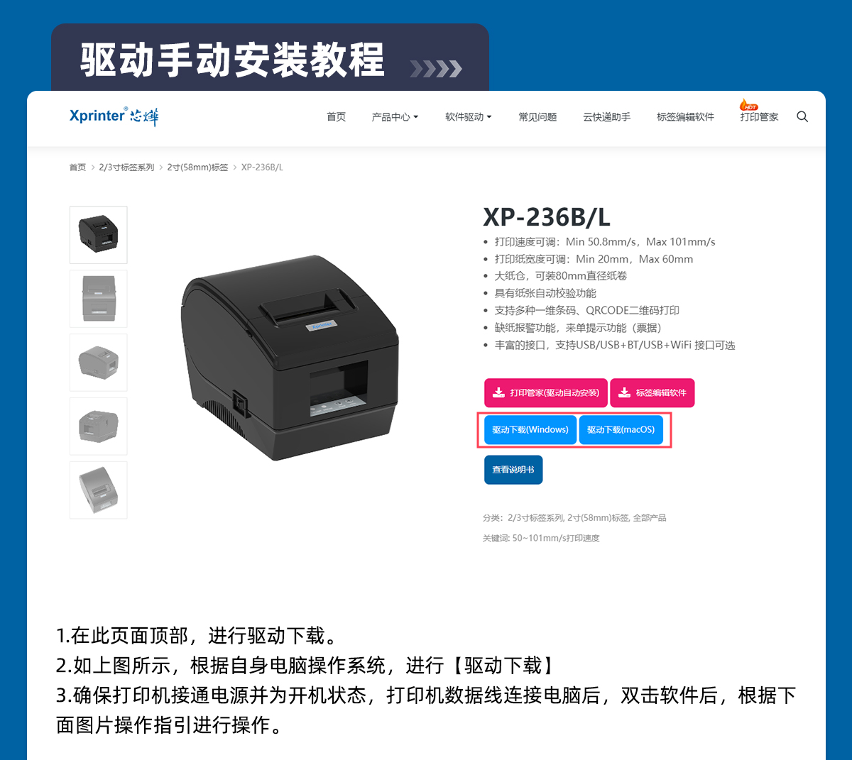 | 本网站主要提供芯烨(Xprinter)品牌商品相关软硬件使用操作服务信息,仅供参考。若因您使用的产品非芯烨品牌、非对应型号、特供或定制型号等,可能无法参照网站内教程使用,如因产品不匹配造成的问题及损失,本网站无法提供服务支持并不承担任何法律责任。 | ||