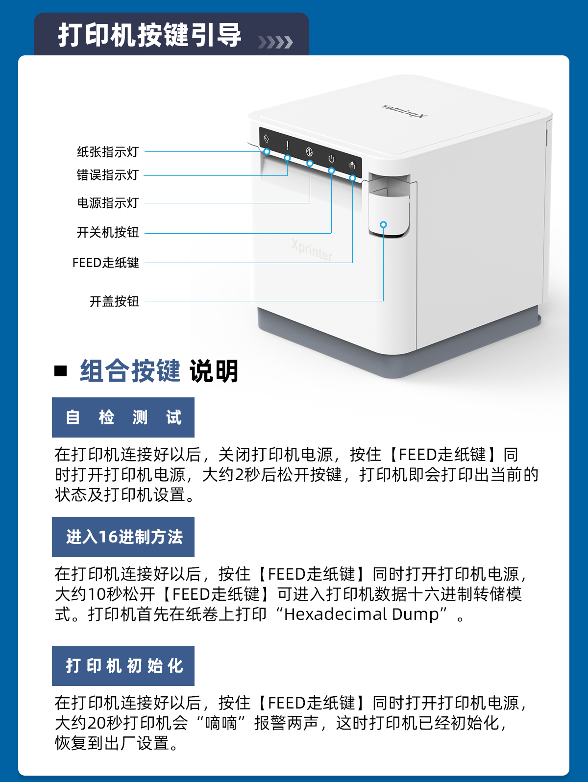 - 可视化LED 显示灯,电源、报错、缺纸实时提示